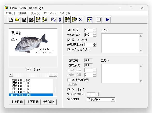 動きが遅いと思いますので、少し間引いて画像の枚数を半分にします。