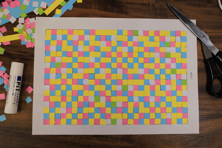 上で紹介しているページで色鉛筆で塗り潰してモザイクアートを作る方法を紹介しました。ところが色鉛筆ではなくて色紙を貼り付けて作るモザイクアートの方が需要があるようです。