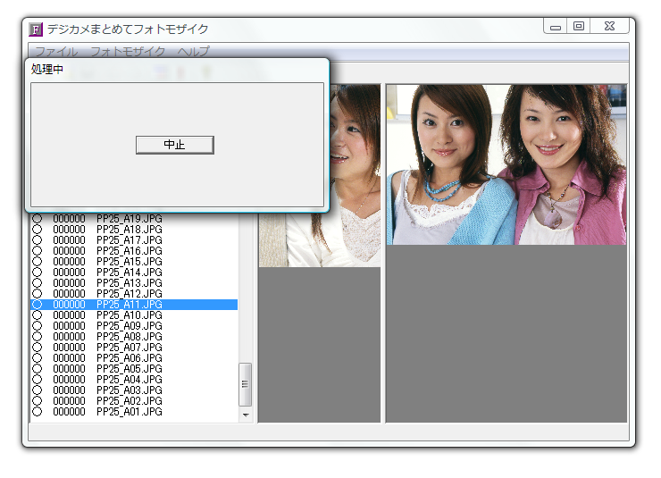 フォトモザイク処理が実行されます。まずはコマ画像リストを読み込みます。処理中ウィンドウの中止ボタンで中止できます。