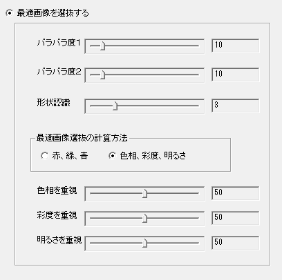 最適画像選抜の計算方法として「色相、彩度、明るさ」を選択すると、スライダーの名称が色相、彩度、明るさを重視に変化します。