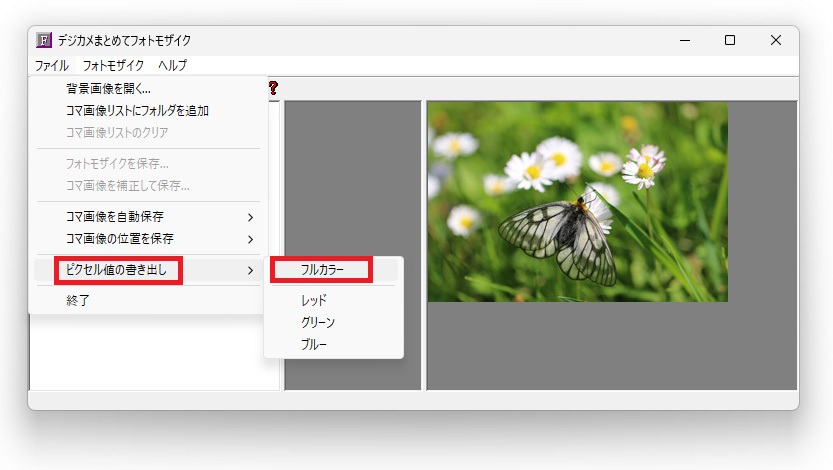 「ファイル」「ピクセル値の書き出し」「フルカラー」とします。