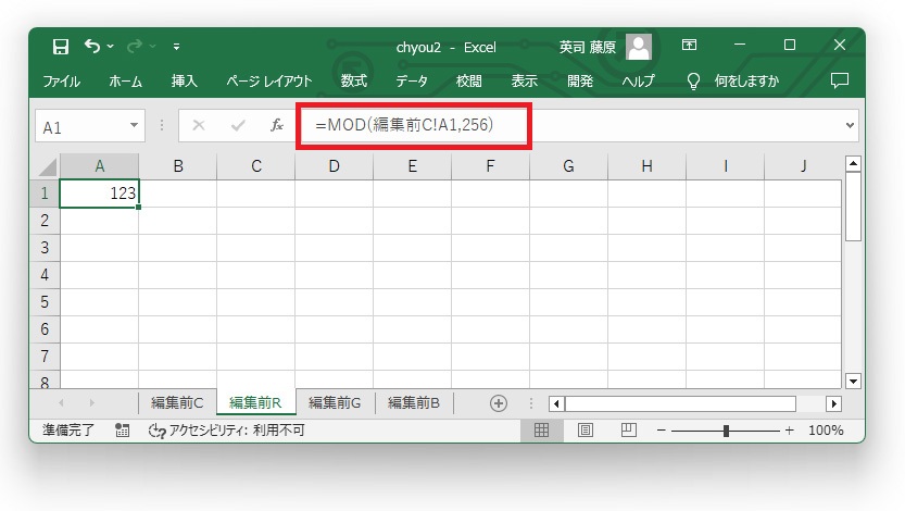 「編集前R」シートのA1セルに下記の式を入力します。MODは余りを求める関数です。