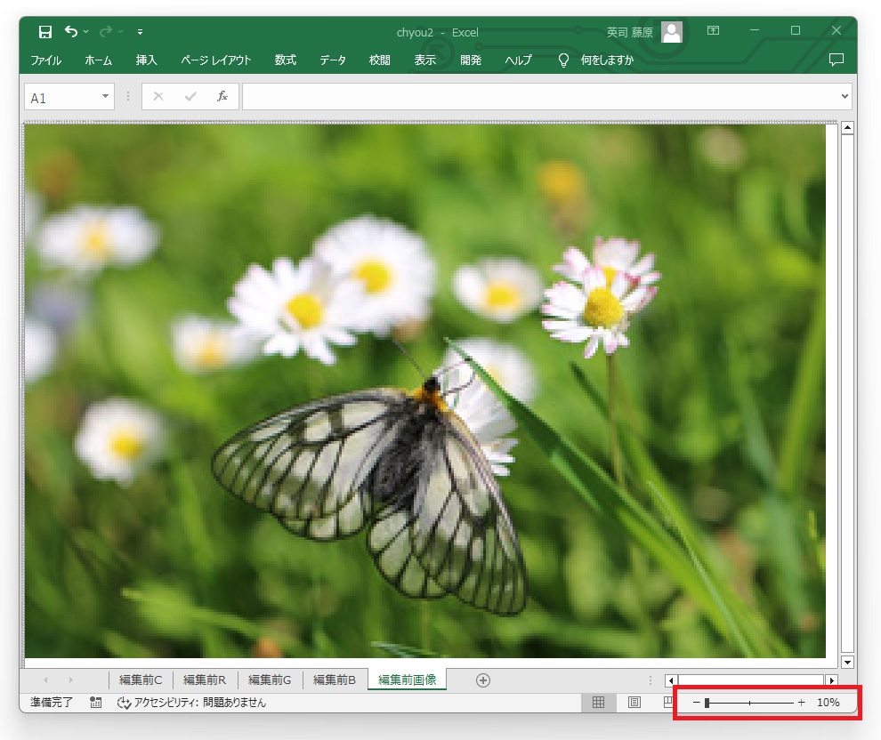エクセルで具体的にやってみます。先程のチョウの写真を変換したエクセルに戻ります。