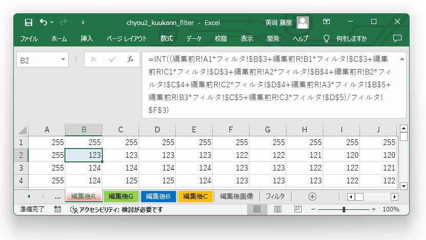 ただし上下左右の1行1列には数式は入れず、255を入力しています。RGBが全て255の場合は白になりますから、編集後の画像の上下左右の1行1列は白になります。