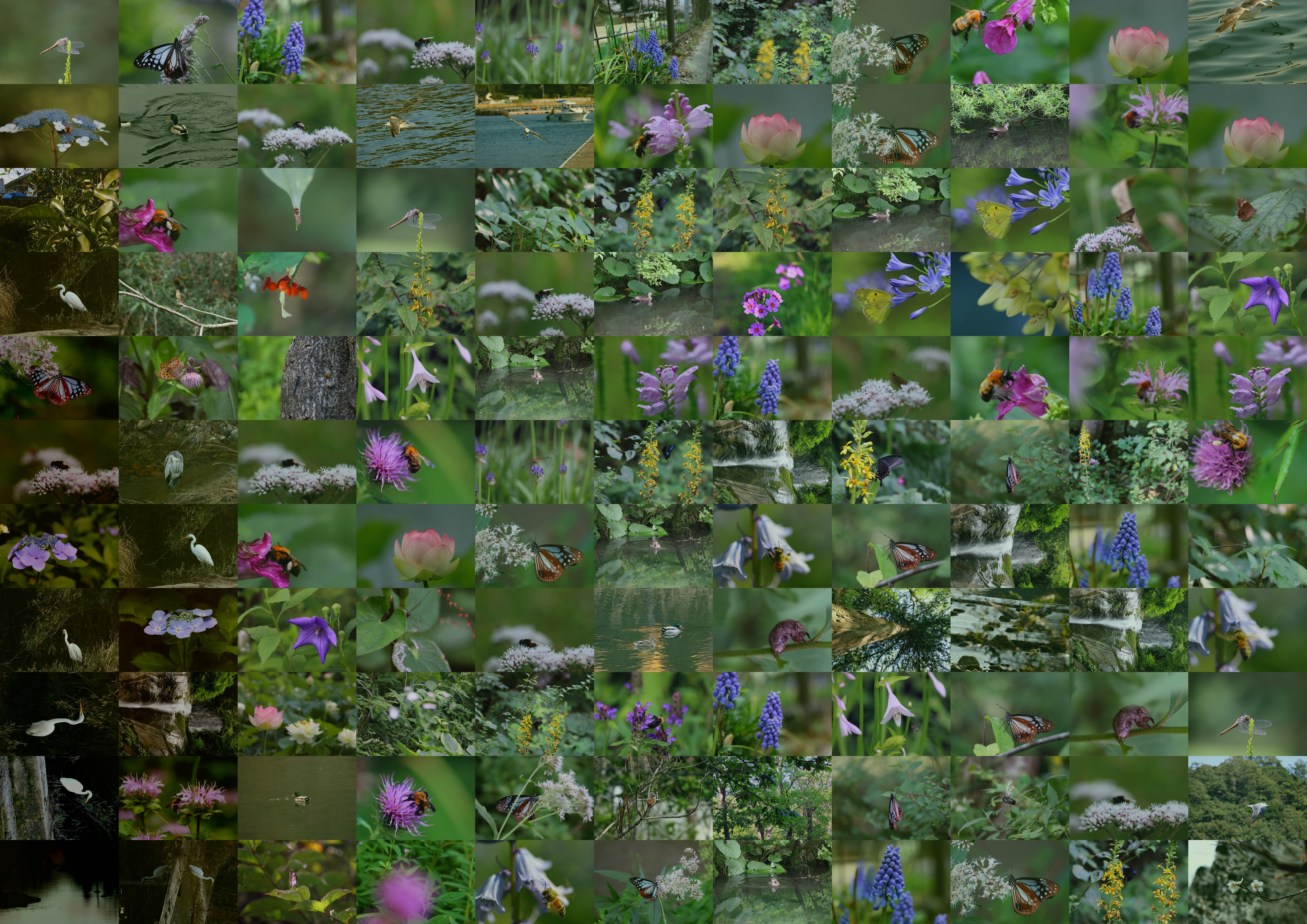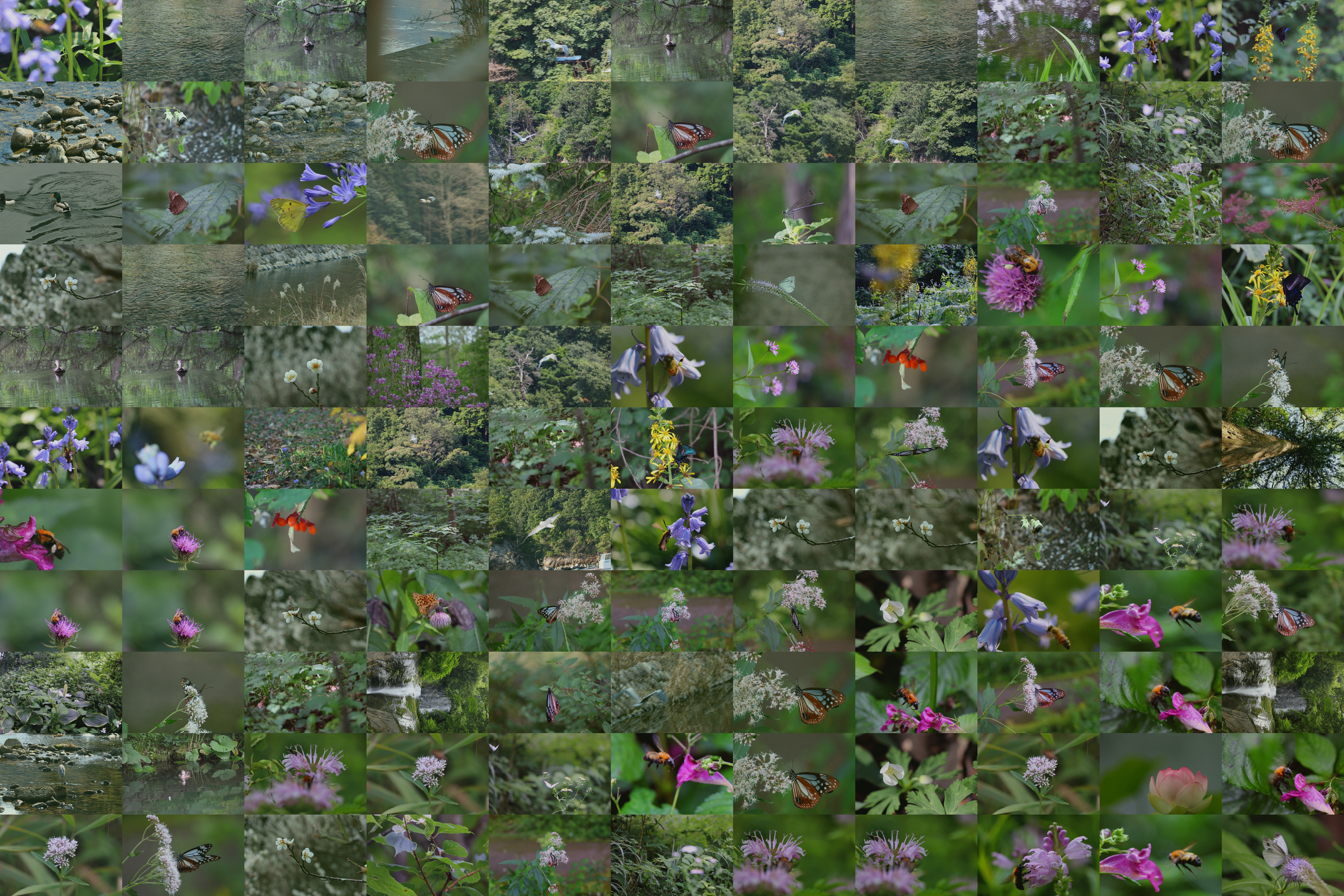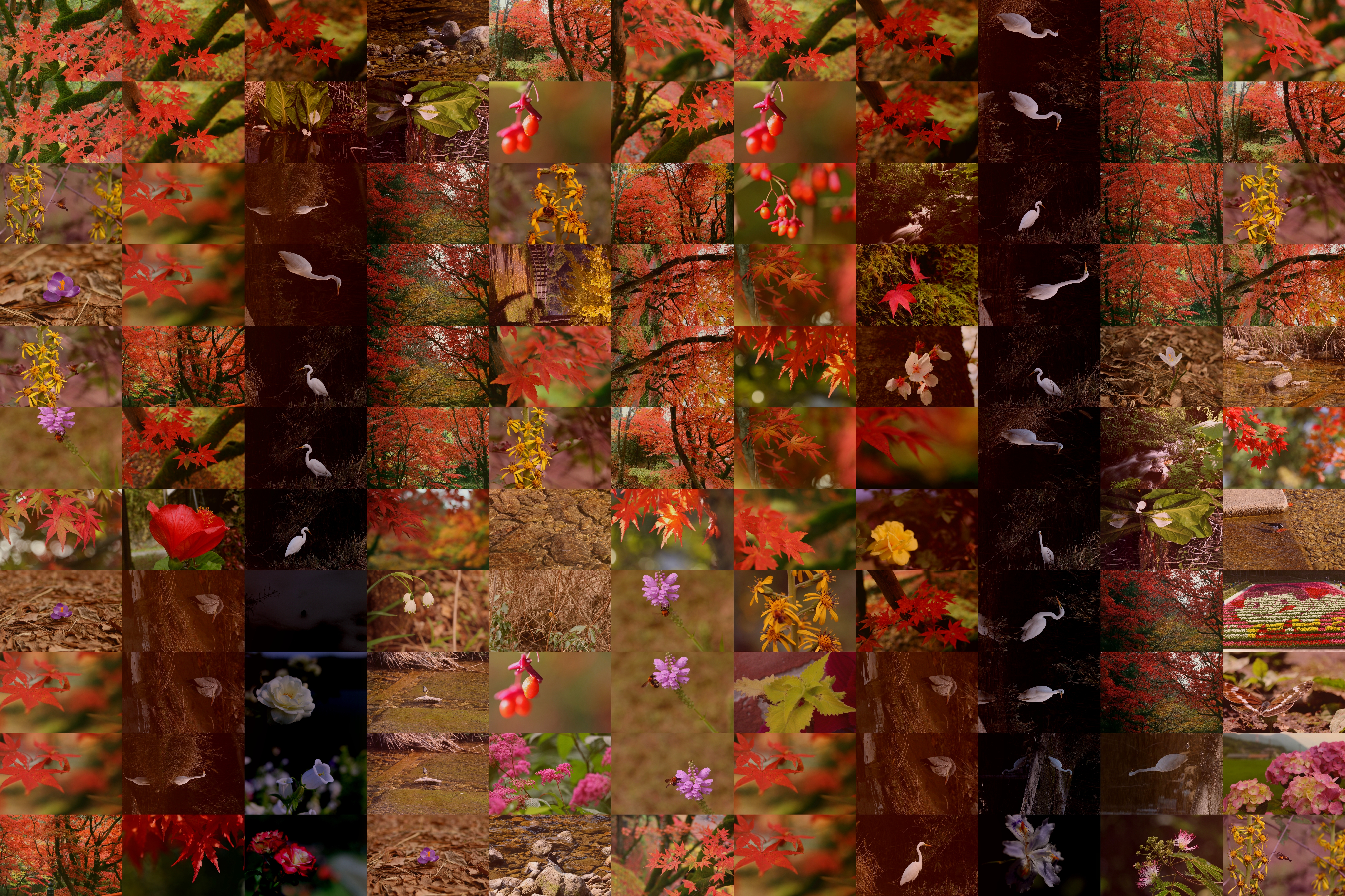 編集例をもう一つ示します。写真12100枚を9回ずつ使用して作ったフォトモザイクです。白枠で囲まれた画像一枚をA3サイズにプリントしたとすると、幅12m、高さ8mのフォトモザイクになります。