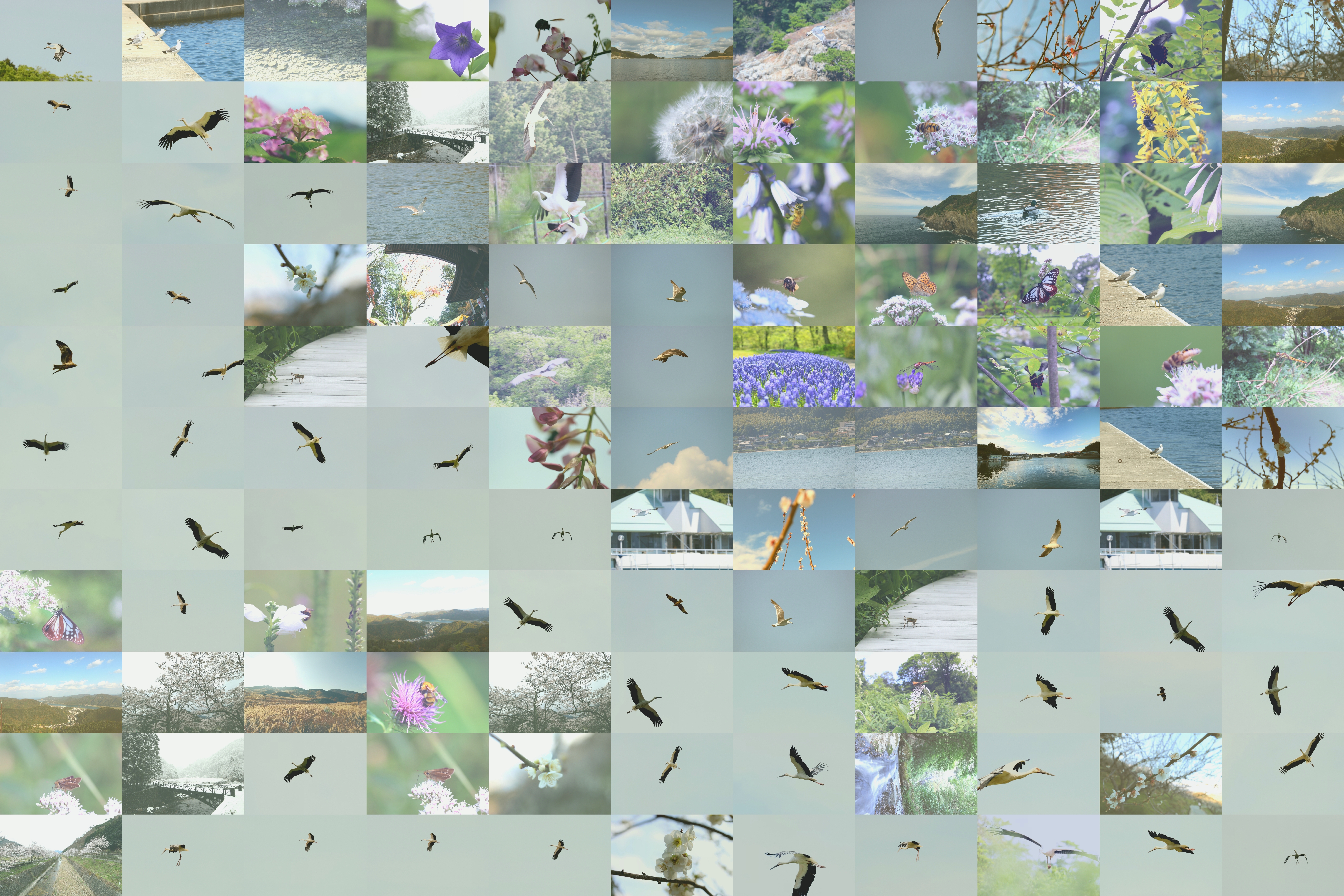 白い枠に囲まれた領域が一枚の画像になっています。横方向10枚、縦方向10枚の計100枚の画像に分割されています。目の周辺、口の周辺、あごのラインなど輪郭が斜めの部分を見ると、どのように写真が配置されているのか分かりやすいと思います。