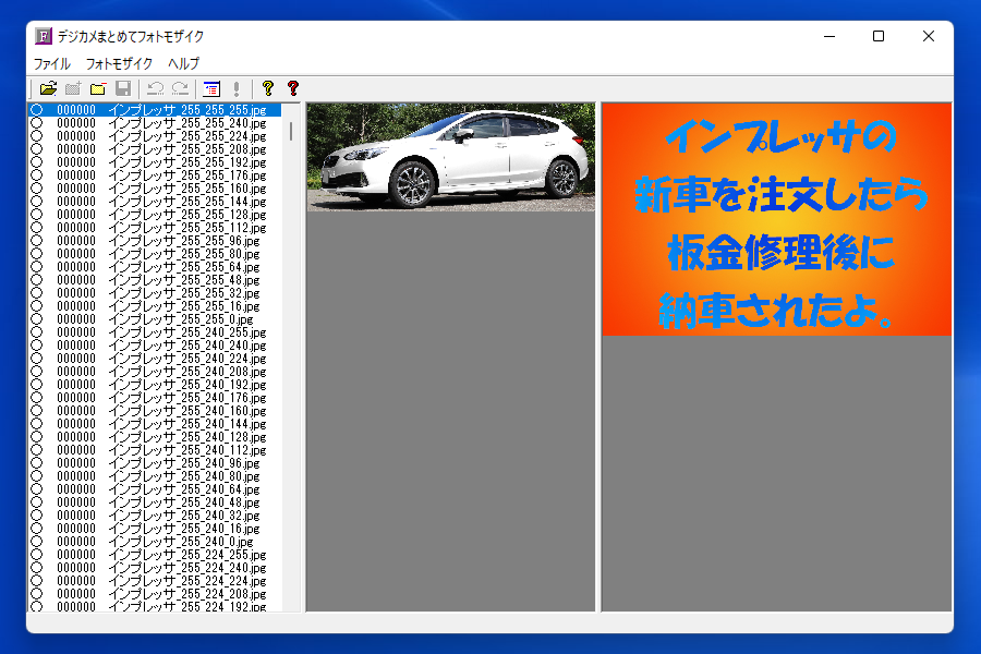 ここまでの作業でモザイクアートのコマ画像と背景画像が出来ました。デジカメまとめてフォトモザイクでモザイクアートを作っていきます。