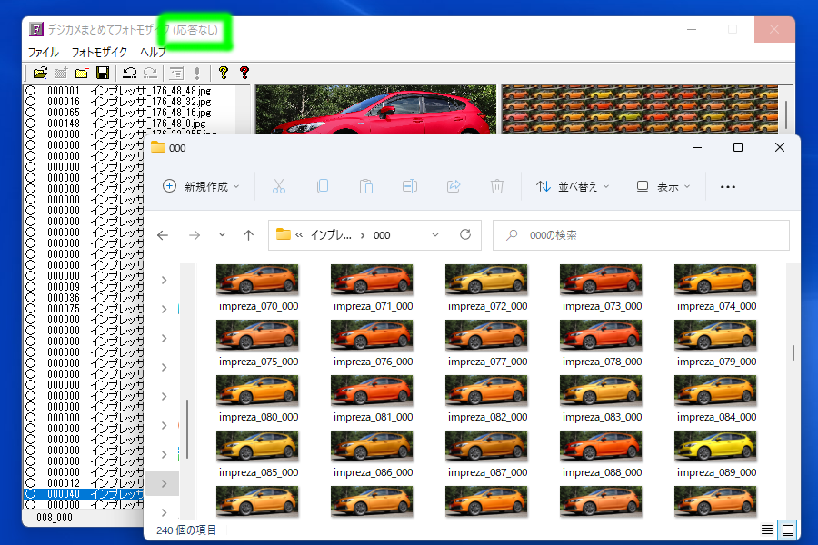 コマ画像を保存中は、デジカメまとめてフォトモザイクのウィンドウは応答なしになってしまいます。動作しているかどうか不安に感じる場合は、エクスプローラーで保存先を確認してみて下さい。コマ画像がどんどん保存されていっている様子が確認できると思います。